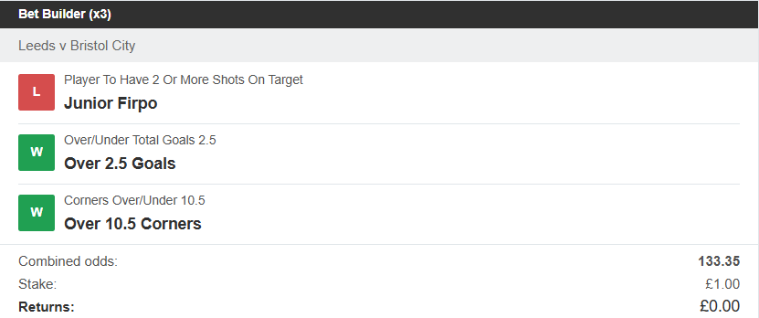 This is the first time we have drawn a blank in a game with the tips. Only 9 Corners (at least one obvious corner not given). I thought Raphinha had scored, but it was clearly an own goal and no joy on the yellow cards.